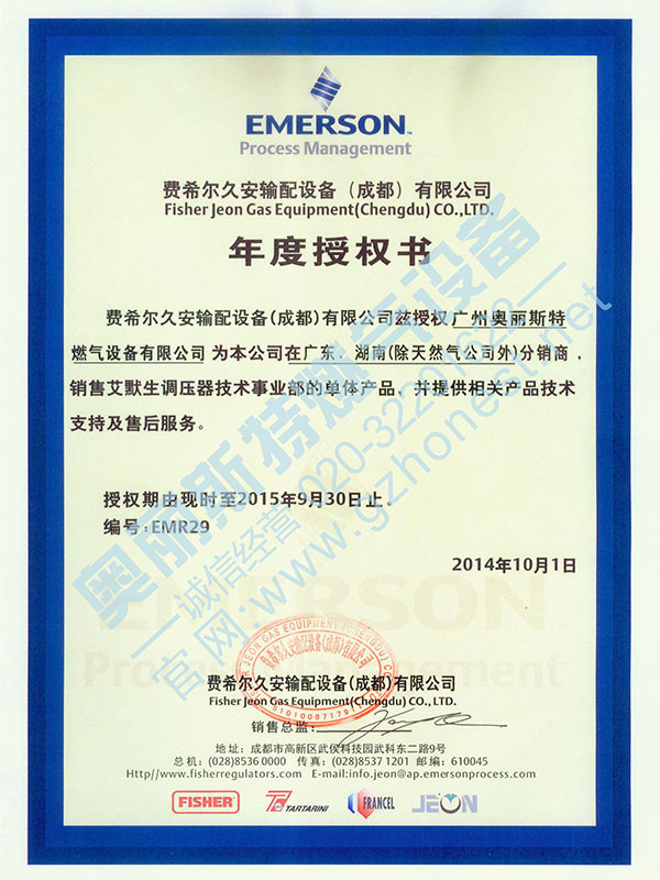 2015年fisher授權(quán)證書 水印